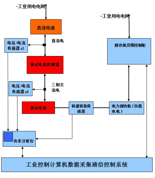 • 電力測(cè)功機(jī); • 計(jì)算機(jī)測(cè)量控制系統(tǒng); • 轉(zhuǎn)速扭矩傳感器; • 電流電壓傳感器; • 鑄鐵平臺(tái); • 測(cè)功機(jī)變頻控制柜; • 彈性聯(lián)軸器; • 被測(cè)電機(jī)安裝支架。